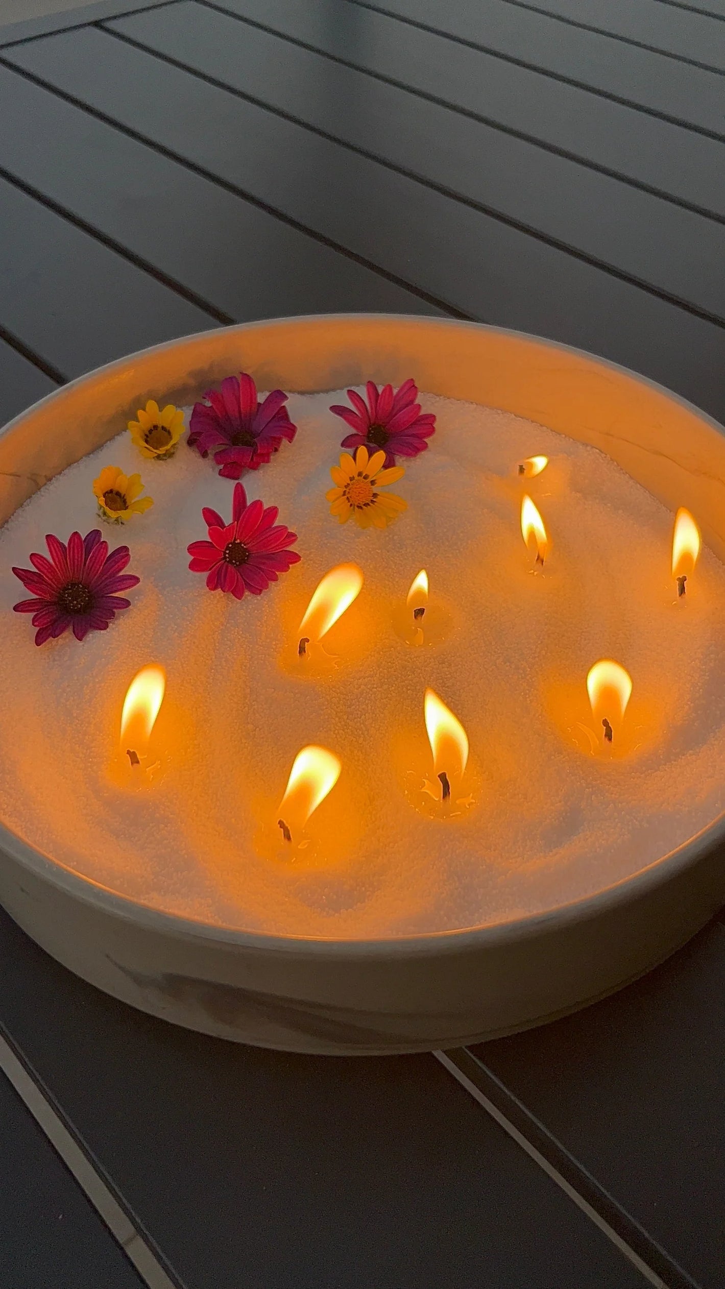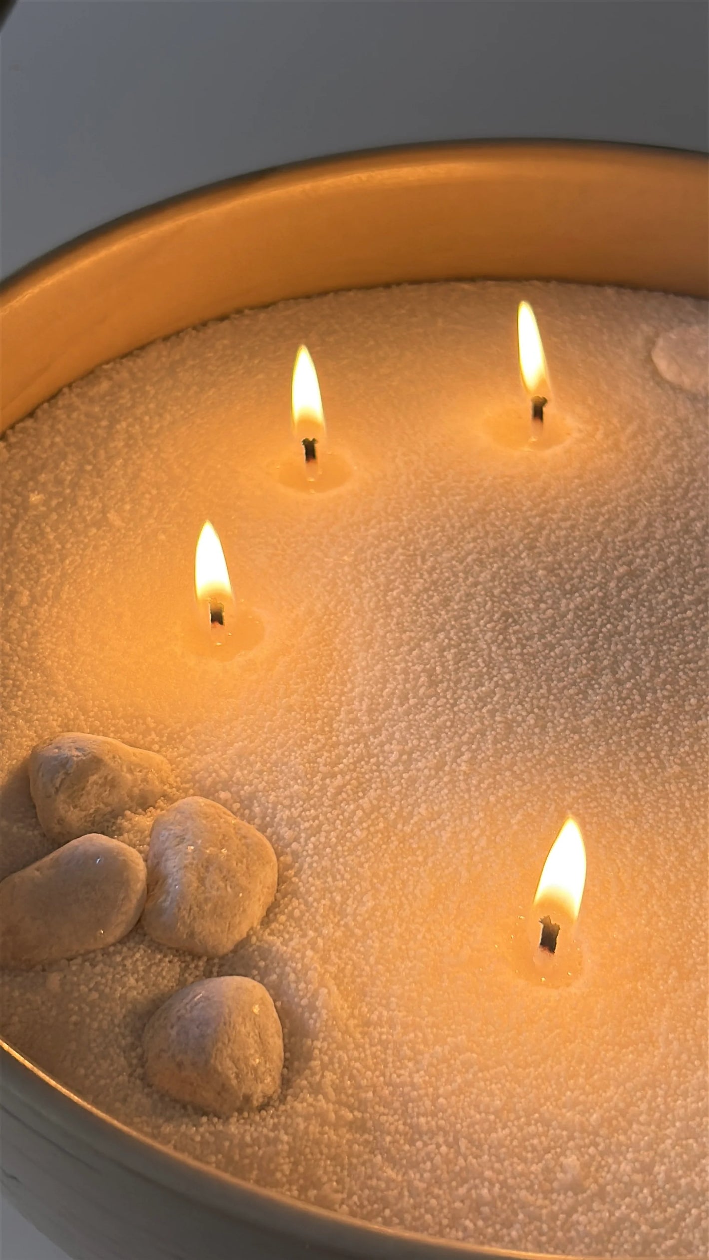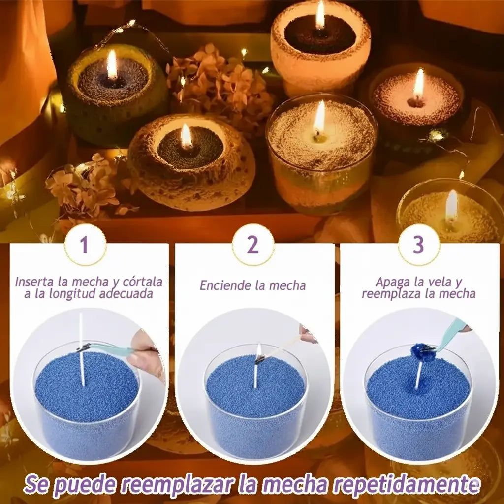 Enciendes varias mechas sobre la arena, la luz cálida transforma el espacio y, por unos minutos, todo se detiene.